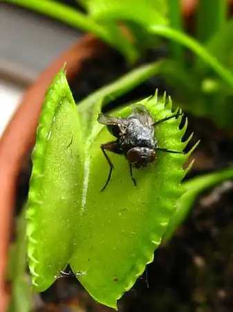 На торфяных болотах в восточной части Северной Америки встречается насекомоядное растение венерина мухоловка. Каждый ее лист поделен на две части. Нижняя часть, как у всякого листа, служит для воздушного питания растения, верхняя же — ловчий орган. Он состоит из двух подвижных долек, по краям которых расположены острые зубцы. На поверхности каждой дольки сидят три длинные и упругие щетинки. Кроме того, по всей верхней стороне долек рассеяны многочисленные мелкие красные желёзки, как у жирянки.