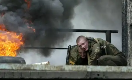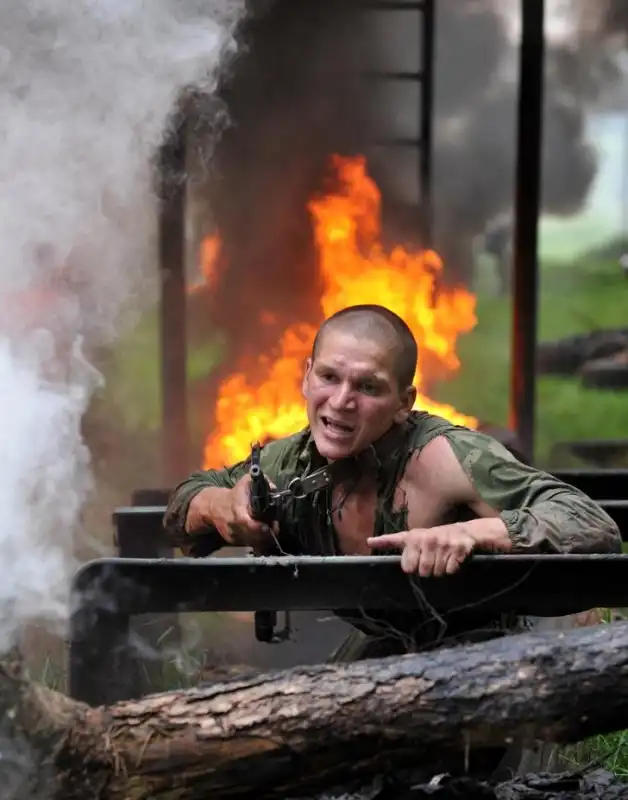 В этом году в учебном центре внутренних войск «Воловщина» во время первого этапа испытаний бойцы преодолели болото, колючую проволоку, барьеры, деревянные стены, бетонные щиты, «зараженный» участок с капканами, натянутой проволокой, огненно-штурмовую полосу, водную преграду. (VIKTOR DRACHEV/AFP/Getty Images)
