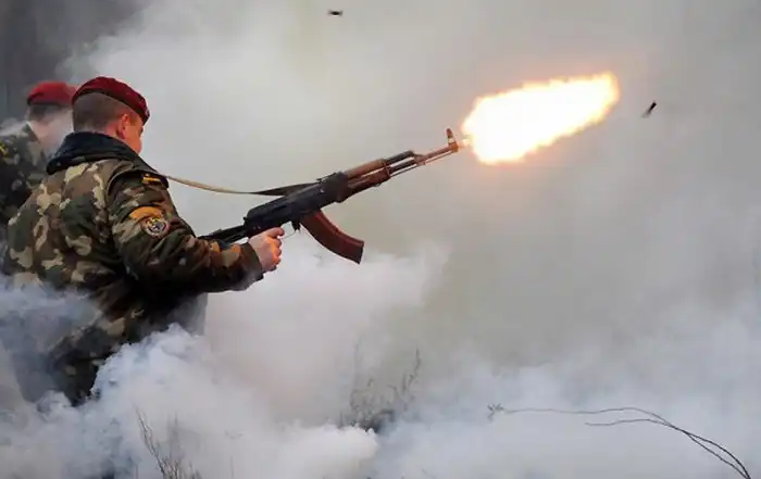 Спецназовец в краповом берете стреляет из автомата Калашникова, в то время как участники квалификационных испытаний бегут через клубы слезоточивого газа. Снимок сделан 22 октября 2009 года в учебном центре ВВ МВД «Воловщина» под Минском. (VIKTOR DRACHEV/AFP/Getty Images)