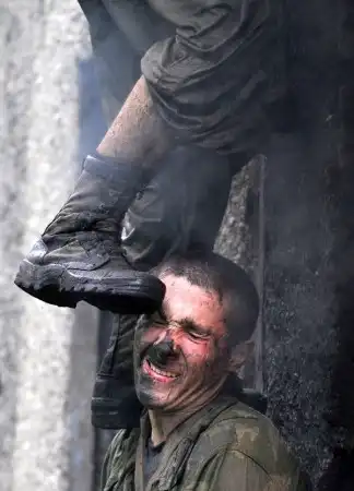 После прохождения первых двух этапов, все, кто остался в строю, должны выдержать 12-минутный спарринг с четырьмя сменяющими друг друга через три минуты противниками, трое из которых уже являются обладателями краповых беретов. (VIKTOR DRACHEV/AFP/Getty Images)