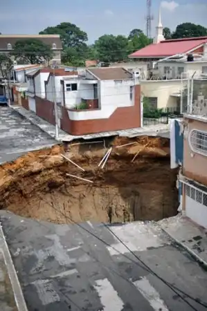 Загадочное явление произошло в столице Гватемалы вечером 29 мая. Помимо ущерба, нанесенного тропическим штормом «Агата», Гватемала-сити пострадала от необъяснимого провала в центре столицы – в практически идеально круглую дыру в земле ушло трехэтажное здание швейной фабрики и небольшой жилой дом.По разным источникам диаметр провала составляет около 20-30 метров, глубина по приблизительным подсчетам – 30-60 метров, во всяком случае, дна не видно даже с вертолета. По словам очевидцев, погиб один человек, однако местные власти пока не подтверждают эту информацию.