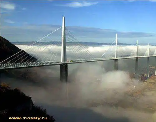 1 Самый высокий вантовый мост в мире - Виадук Мийо Мост виадук Мийо раскинулся над рекой Тарн на высоте 270 метров от земли. Этот мост так же является и самым высоким вантовым мостом в мире. Самая высокая опора моста, имеет высоту 343 метра, высота этой опоры на 20 метров выше Эйфелевой башни. Длина моста 2,5 км. Виадук Мийо расположен на юге Франции, не далеко от города Мийо, отсюда и такое название моста.