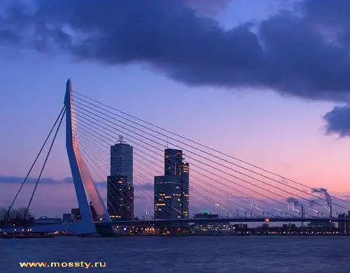 4 Лебединый мост в Роттердаме В 1996-ом году был открыт мост в Роттердаме. Южная и северная часть города, отделяется друг от друга рекой New Meuse, для того что бы соединить части города и был построен этот мост. Форма этого моста очень своеобразна, и более того, мост имеет всего одну опору, поэтому его называют "Лебединым", то есть мост по кличке "Лебедь". Длинна этого моста 800 метров. Бюджет строительства составил более 110 млн. долларов.