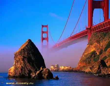 6 Очень красивый висячий мост «Golden Gate», что в переводе на русский язык означает «Золотые Ворота». Мост был построен в 1937-ом году, и несколько лет был самым большим подвесным мостом в мире. Протяженность этого моста 1970 метров, а высота проезжей части 67 метров от уровня воды. Соединяет берега Сан Франциско и округа Марин.