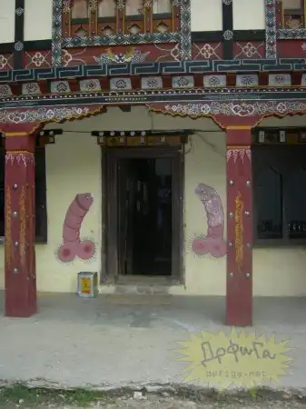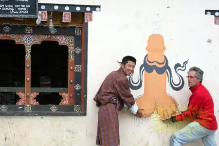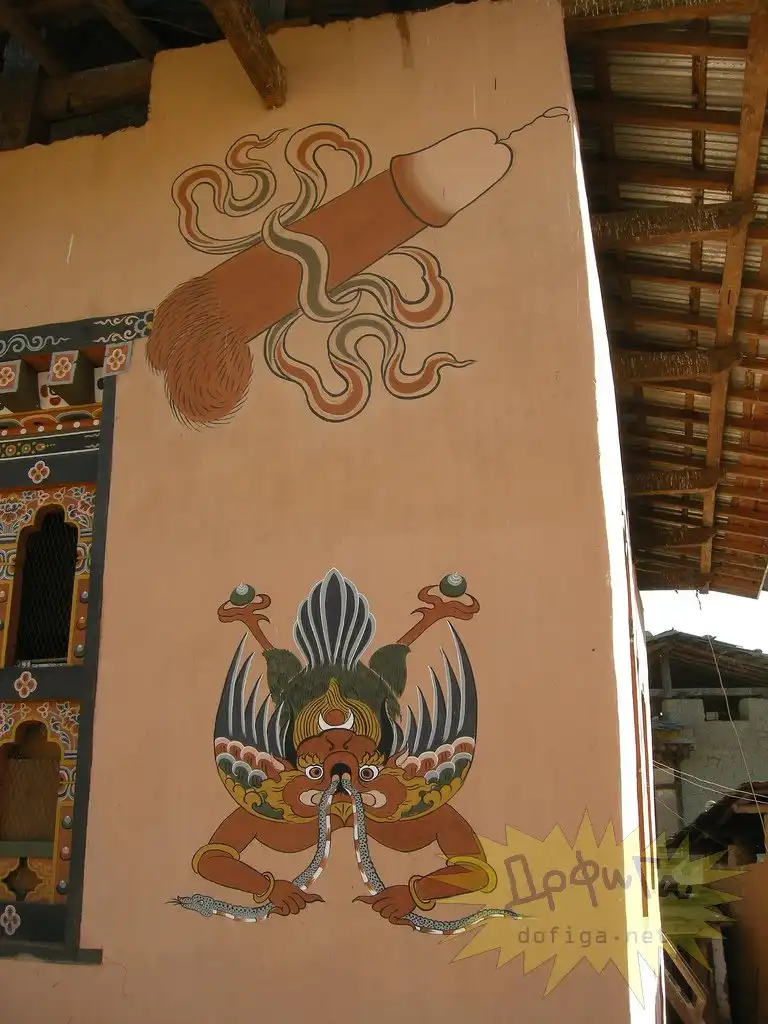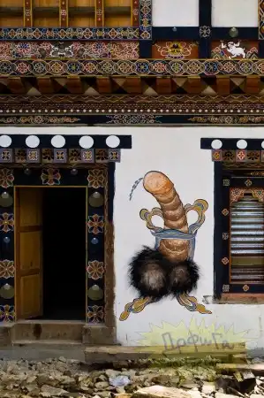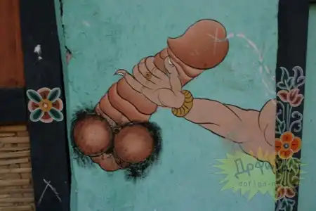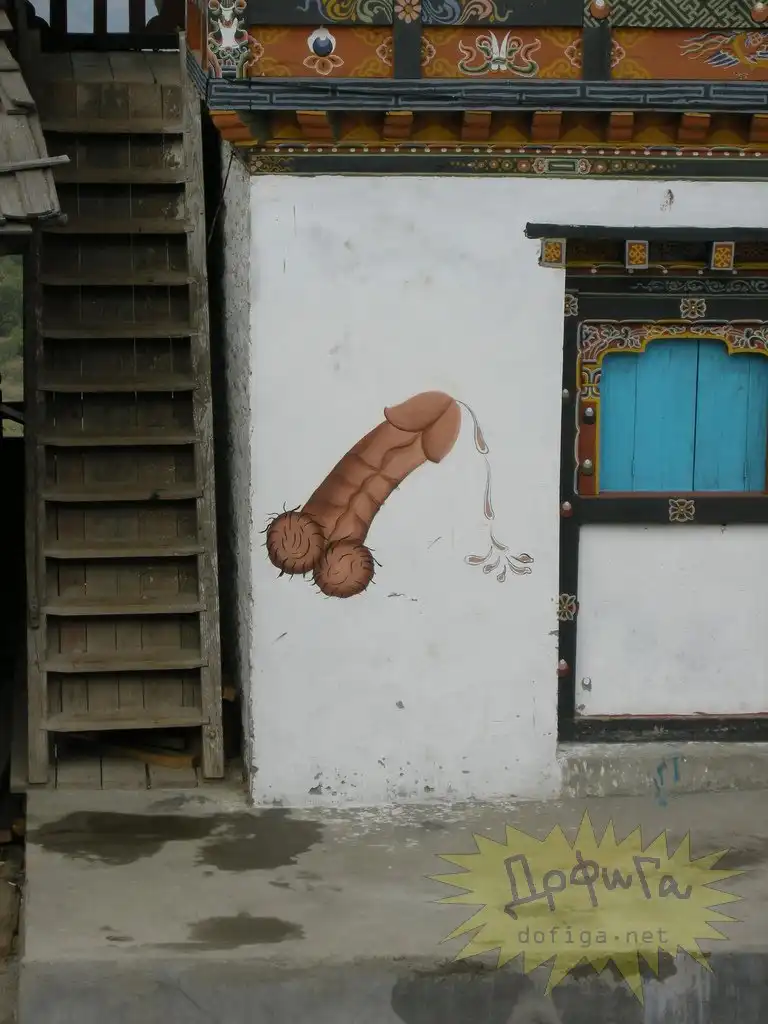 Бутан - глубоко религиозная страна , с огромным количеством легенд и поверий. Так вот бутанцы считают, что на их дома, магазины, храмы может напасть ведьма и чтобы её отпугнуть они рисуют пенисы на зданиях. Согласно поверью , пенис залезет в рот злой ведьме и она станет добрая :-))))))))) Для этих целей жители ещё и статуэтки пенисов дома держат , ну так , на всякий случай , если увидят колдунью сами , чтобы засунуть ей в рот этот фаллос и обезоружить несчастную :-))))))))))