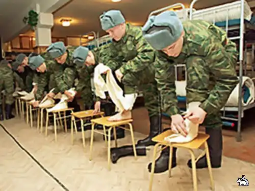 Особое внимание — к портянкам. Не важно, сапоги у вас будут или берцы — всё равно вы будете пользоваться портянками. Сразу научись правильно мотать портянки — иначе мгновенно набьешь кровавые мозоли. Это очень важно — сделать всё правильно сразу. Раз ошибешься — неделю будешь мучиться. А оно тебе надо? Если портянки сбились — найди время перемотать.
