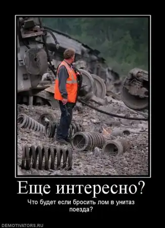 Резюме: Лом изогнется и выпадет, либо сломается от второго удара. Люди попадают но останутся живы. Поезд останется на рельсах, незначительно потеряв скорость. Будет сломана минимум одна балка. Унитаз изогнется и станет пригодным разве что для музея и для очередного демотиватора.