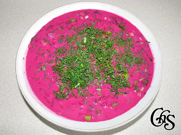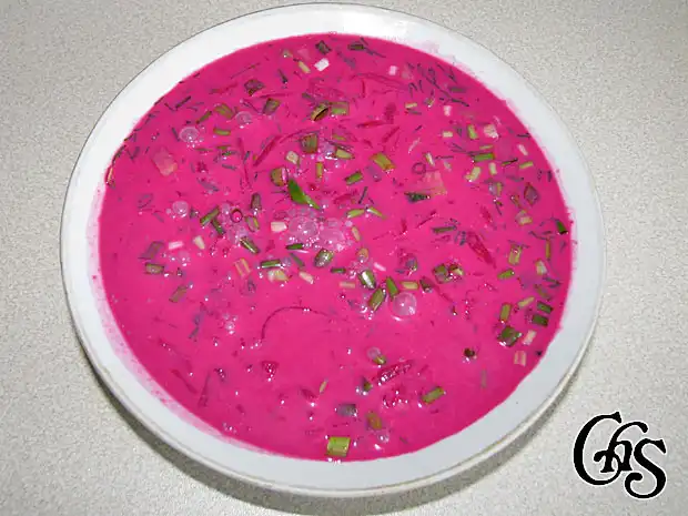 В теплый, но не горячий свекольник добавляем сметану. Много. До получения гламурного цвета.