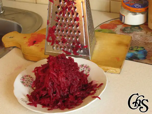 Остывшую свеклу натираем на терку. В принципе, можно и сразу натереть и варить уже тертую, но мне больше нравится так. Опять же из-за цвета. Ну не люблю я вываренную, почти белую свеклу. А тут она – во всей красе!