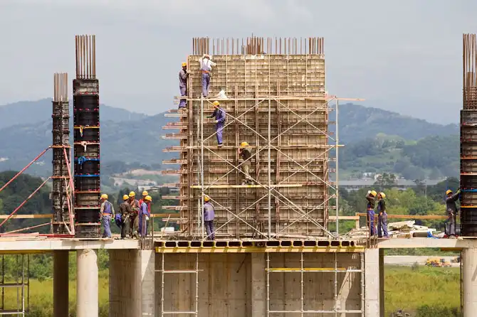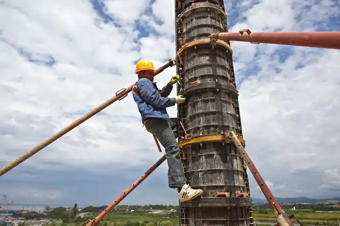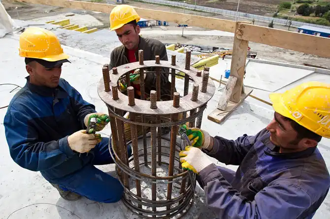 В тот день работы велись на нескольких этажах сооружения. Народу, на первый взгляд, было немного. Наверху рабочие собрали опалубку для заливки бетона, внизу — женщины в касках замазывали щели и дефекты в бетонных плитах.