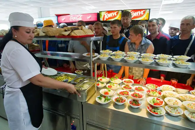 Шеф-повар пустила меня на свою территорию. Обеденное время только началось и рабочие столпились у раздачи, ожидая, когда их начнут кормить.
