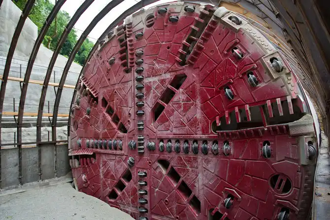 Щит не только грызет скалу, делая в ней тоннель, но и тут же укладывает по его диаметру бетонные тюбинги. Космическая пушка справа — бур для взятия образцов породы.