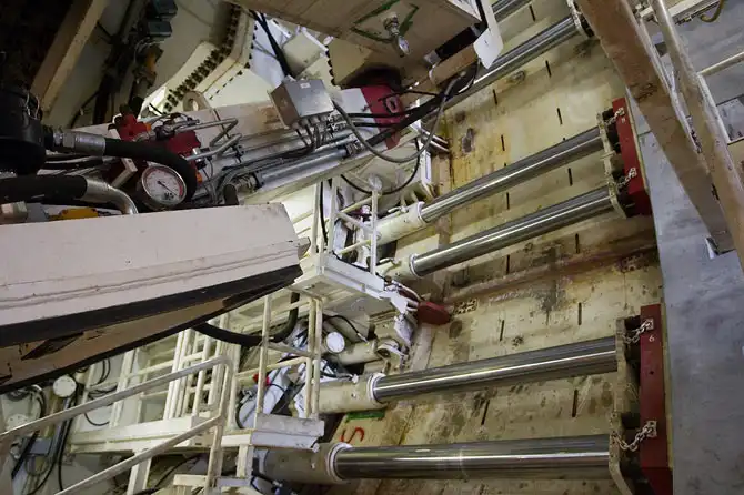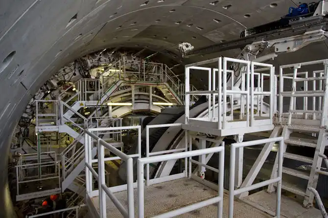 Щит выстилает поверхность тоннеля тюбингами и для того, чтобы двигаться дальше, отталкивается от них с помощью гидравлики.