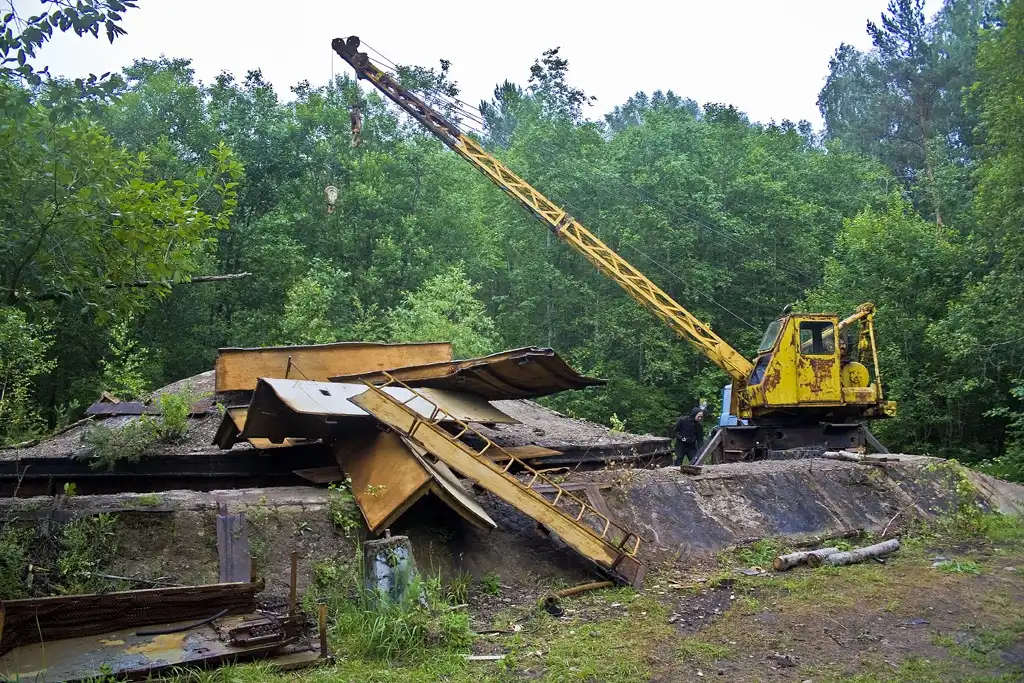 Краном достают срезанный метал из шахты, с последующе целью его продажи( я так понимаю)