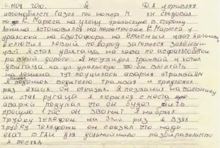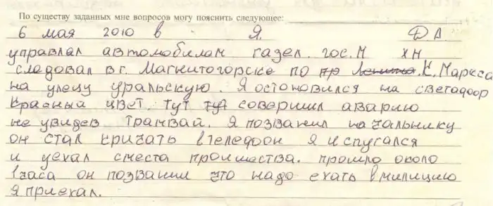 Это объяснительная по поводу ДТП из ГАИ. (Водила 81 года рождения. Фамилия имя/отчество - русские.)