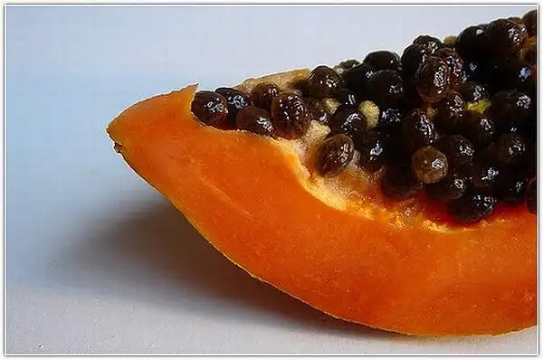 Папайя (дынное дерево). Выращивают во многих странах в тропиках. Плоды имеют розовую или золотистую мякоть с семенами, которые обычно удаляют. Семена обладают пряным вкусом и в сушёном виде могут использоваться как острая приправа. Сладкие сочные плоды исключительно питательны. Как и другие оранжево-красные фрукты, папайя - ценный источник бета-каротина. Половина плода средней величины удовлетворяет суточную потребность взрослого человека в витамине С, а также даёт большое количество кальция и железа. Идеальная пища для больных, так как мякоть легко жевать и проглатывать. Сок папайи содержит папаин - фермент, схожий с пепсином, вырабатываемым пищеварительной системой организма для расщепления белков.