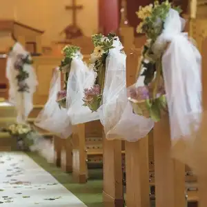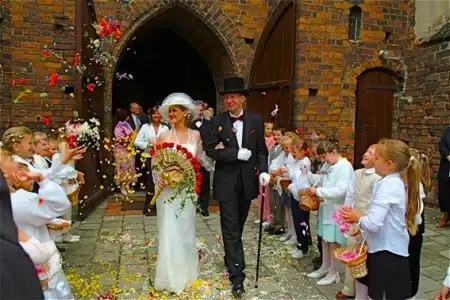 Под звучание органа молодые выходят из церкви, где на них сыпятся не крошки свадебого торта, как было в прежние времена, а подковки, сердечки, бантики, звездочки — символы благополучия и удачи.