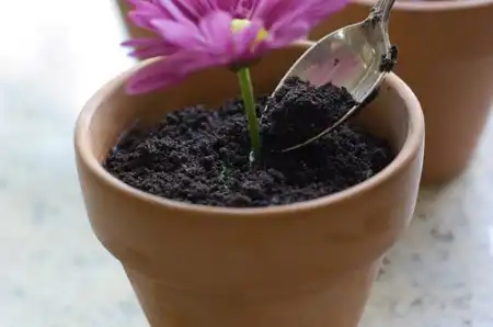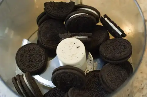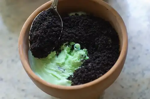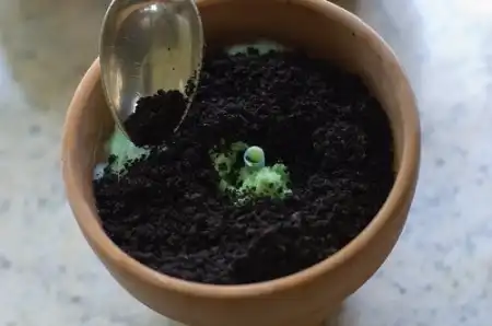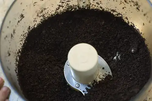 Пока горшки замораживаются нам необходимо изготовить внешнюю, видимую часть грунта. В этом нам помогут молотые шоколадные печенья. Молоть проще всего в кухонном комбайне. Если его нет, можно просто положить печенья в плотный поэлитиленовый пакет и поездить по ним скалкой до получения однородной массы.