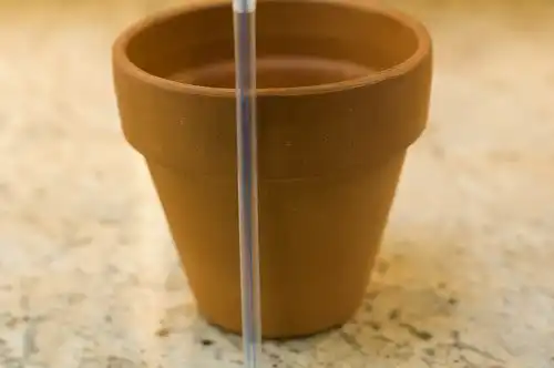 Далее, берем трубочку для коктейля, отмеряем высоту на 2 см меньше высоты горшка и отрезаем