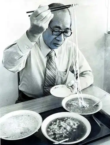 В 1971 году он придумал то, что сделало его лапшу едва ли не самым популярным продуктом на планете. На прилавках магазинов появилась новинка от Андо — лапша Cup Noodle, продававшаяся в водонепроницаемой чаше из пенополистирола. Прямо в нее можно было добавлять горячую воду. Не было больше необходимости перекладывать лапшу, мыть посуду после еды. Лапша от Андо стала по-настоящему экономичной, что по достоинству оценили студенты, холостяки, рабочие, желавшие сэкономить время на обеде. А вскоре после этого в лапшу начали добавлять сушеные овощи, которые, развариваясь в кипятке, создавали впечатление полноценного супа. Но главный, буквально космический прорыв этот пищевой инноватор совершил в 2005 году. Именно тогда появилась лапша быстрого приготовления в вакуумной упаковке, созданная специально для астронавтов.А свое долголетие Андо списывал на ежедневное употребление лапши собственного изобретения.