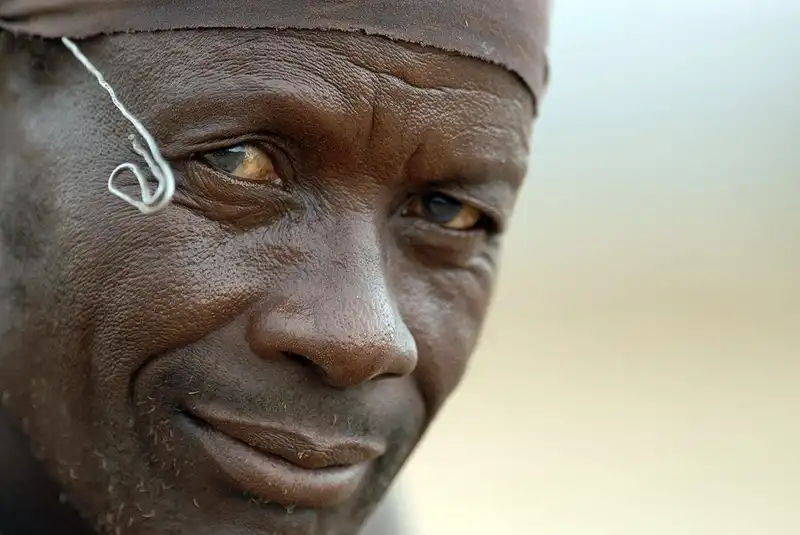 6. Вождь деревни химбу. Мне он показался похожим на актера Моргана Фримана. Каким то выражением глаз что ли. А может дальний родственник. А голубые глаза (если присмотреться к радужке) меня сначала напугали, каким образом, думаю у африканцев голубые глаза. Потом мне рассказали, что это катаракта, которую не лечат, создает такой эффект голубой поволоки