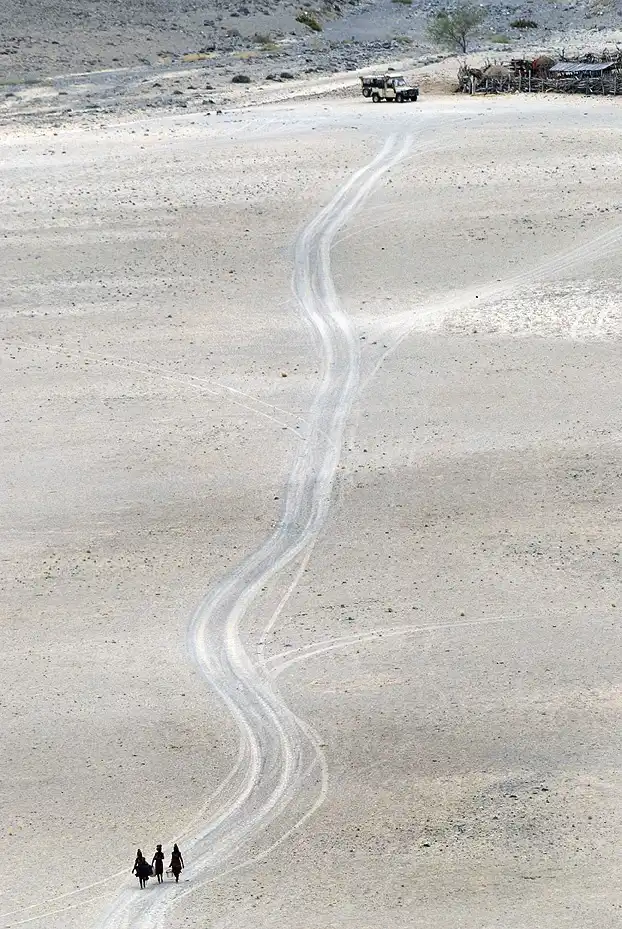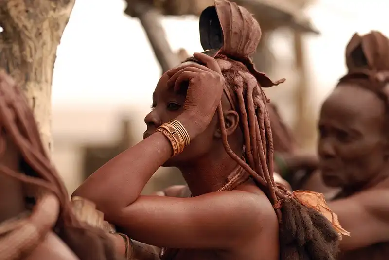 Скоро приезжаем в деревню Пуррос – несколько десятков квадратных домов стоят на открытой всем ветрам равнине. Они даже похожи не на дома,а на контейнеры. Здесь живет народ гереро – у женщин в моде старинные платья и странные головные уборы, отчего каждая дама похожа на акулу-молот. А в нескольких километрах существует традиционная деревня народа химбу. Несколько бедных хижин обмазанных красной глиной. И много местных жителей, таких же красных. Мажутся они охрой с примесями – считается, что эта смесь защищает людей от солнца и насекомых. Они натираются кирпичного цвета порошком с ног до головы, у девушек волосы заплетены в косички и тоже под слоем “пудры”. Постепенно этот цвет заполняет все вокруг – циновки, пол, стены… Нас пускают в деревню и специальный гид прововодит по кругу к каждой хижине. Химбу привыкли к туристам, они мастерят поделки, тем и живут. Когда старуха, заламывает большую по местным меркам цену за деревянного слоника, даже Элейн выразительно качает головой. Но у меня язык не поворачивается торговаться со старухой в набедренной повязке из коровьей кожи.