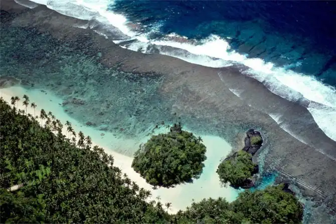 Пляж Вавау, Уполу, Самоа. Вавау – это по сути два пляжа в одном. Первый – обыкновенный – длинное песочное побережье, довольно уединенное, окаймленной пальмами. Но то, что делает этот пляж особенным,- это небольшая пещера, спрятавшаяся за пальмами (на снимке справа). Получившаяся небольшая бухта в этой пещерке полна теплой приятной водой, а когда лучи солнца врываются в эту маленькую обитель, то вода светится различными оттенками синего, бирюзового и зеленого. Поэтому неудивительно, что многие компании, занимающиеся производством различной пляжной одежды и экипировки, пролетают многие мили, чтобы отснять именно здесь фото и видеоматериал.