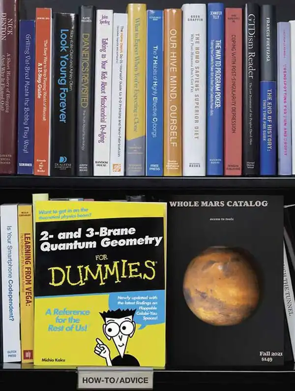 В книжной лавке. Полка с практическими пособиями. «Краткая история блогинга», «Конец истории. На этот раз наверняка» Фрэнсиса Фукуямы, «Двух- и трехволновая квантовая геометрия для чайников». 2021 год.