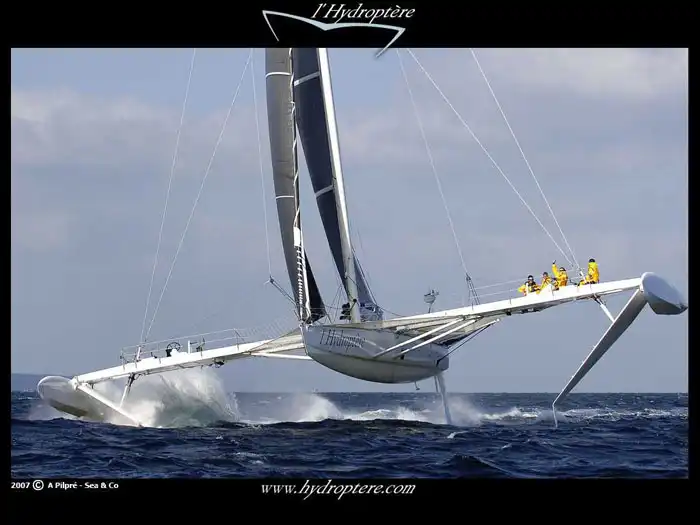 Самолетную схему установки подводных крыльев можно рассмотреть на тримаране Пан Дьюик VII. Этот 59-футовый красавец был изготовлен из профилированного алюминия, что значительно облегчило его конструкцию. Вес судна составил чуть более 12 тысяч фунтов. Два передних крыла были установлены с размахом поперечного бруса в 66 футов. Это оказалось на 7 футов больше всей длины корпуса тримарана. Если установить крылья под углом в 45 градусов, то при ровном киле на тримаране будет полностью отсутствовать крен. Передние крылья в данном случае будут нести около 65 % нагрузки. 35 % нагрузки будет приходиться на кормовое крыло, которое выполняет функцию руля и удифферентовки. Мачта в Пан Дьюике работает в большей степени на растяжении, а не на сжатии. Это является следствием того, что поворотная мачта раскреплена двумя трубчатыми стойками, они в свое время не опираются на поперечный брус. Эта конструкция также не содержит вант. Проведенные исследования показали, что тримаран, при таких условиях и конструкции, будет выходить на крыло на скорости в 12 узлов. После этого ему не составит труда набрать 20-25 узлов скорости. Такое движение может гарантировать пересечение Атлантики примерно за 15 суток.