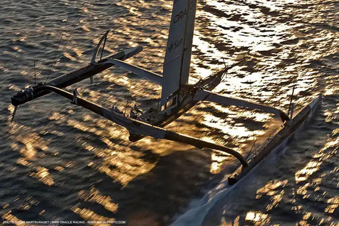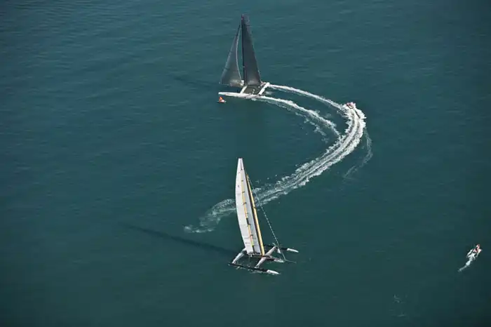 В отличие от катамаранов, тримаран характеризуется низким расположением центра тяжести, что гарантирует малый момент инерции касательно продольной оси. Все это гарантирует высокую остойчивость судна, наряду со снижением резкости бортовой качки. Кстати, немаловажное значение в этом играет большая ширина поперечного мостика. Хорошее лавирование тримаранов обеспечивается благодаря носовому и кормовому свесам корпуса судна. При этом лавирование также обеспечивается отрывом наветренного корпуса от воды. Во время слабого ветра тримаран ходит на основном корпусе, в данном случае сопротивление поплавков минимальное. Катамаран может иметь преимущество над тримараном лишь в том случае, если он пойдет с отрывом одного корпуса от воды, но это достаточно близко к его предельной остойчивости.