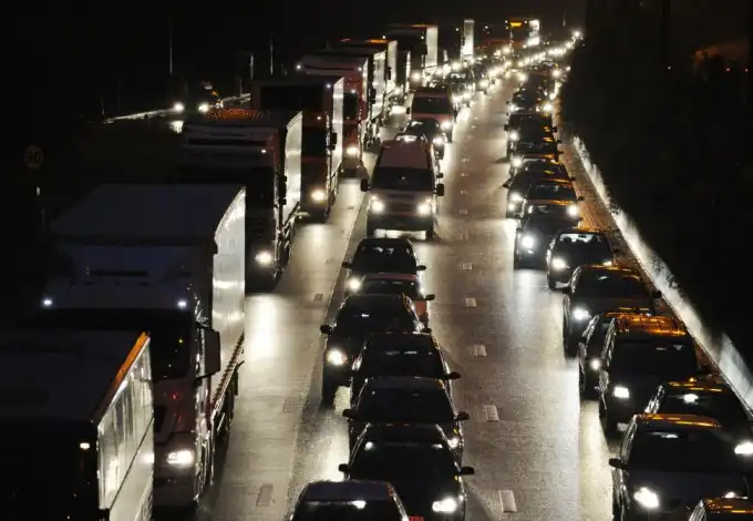 Пробка на дороге недалеко от Брюсселя после забастовки и демонстраций работников транспортных и почтовых служб в Бельгии 6 декабря 2008 года. У некоторых водителей стал заканчиваться бензин и незамерзайка.
