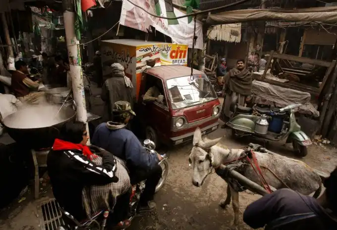 Осел, мотоцикл и фургон стали причиной дорожного хаоса в переулке старого города в Лахоре, Пакистан, 15 февраля.