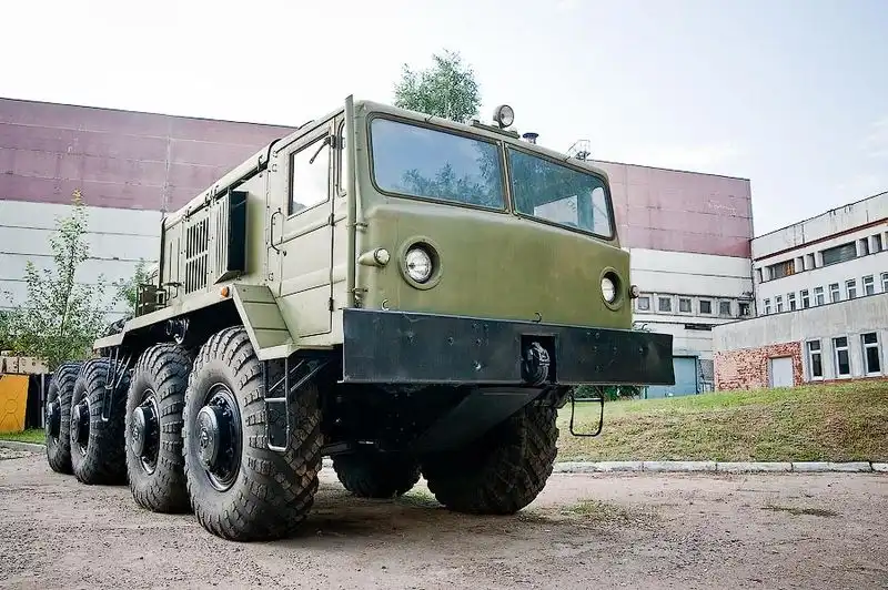 А вот это настоящий тягач апокалипсиса. МАЗ-7907. Ракурс не самый удачный, не передает всей огромности, его загораживали другие машины. 30 метров длиной (высота девятиэтажки), все 24 четыре колеса ведущие. На него должна была монтироваться баллистическая ракета комплекса Целина-2. Пока шли испытания, холодная война закончилась, и единственное, что удалось этому монстру через десять лет после постройки - в 1995 году, перевезти 40-метровый и 100-тонный корабль из Борисова на озеро Нарочь.
