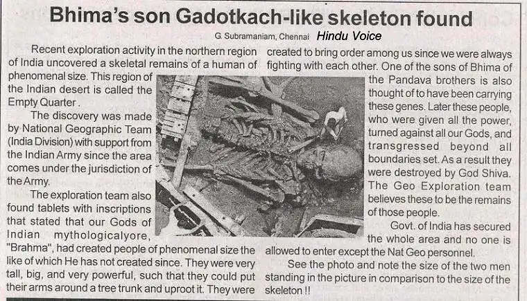 Первое сообщение появилось в интернете, сообщая, что скелет обнаруживался где-то в пустынях западной Индии. Индийское правительство оцепило район Индийской армией и не допускало никого, кроме специальной Национальной Географической группы раскопок.