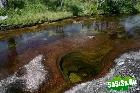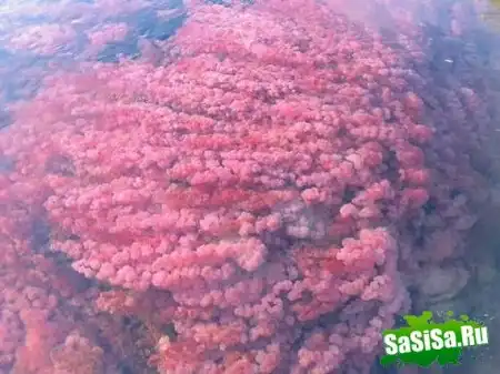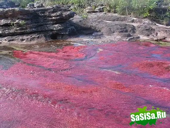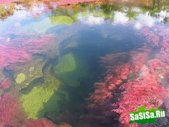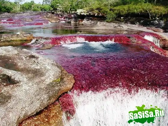 «Река пяти цветов» Каньо Кристалес берет начало на южной стороне горной цепи Макарена, Колумбия. Разноцветность воды обусловлена наличием большого количества различных водорослей. В зависимости от сезона продукты жизнедеятельности того или иного растения окрашивают воду в желтый, зеленый, красный, голубой и черный цвета