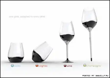 Дизайнеры французской студии Utopik Design Lab, спроектировали универсальный бокал One Glass for Every Drink. Его уникальность заключается в том, что по мере необходимости, он может менять как высоту, так и форму, в зависимости от того, что за напиток в него собираются налить.