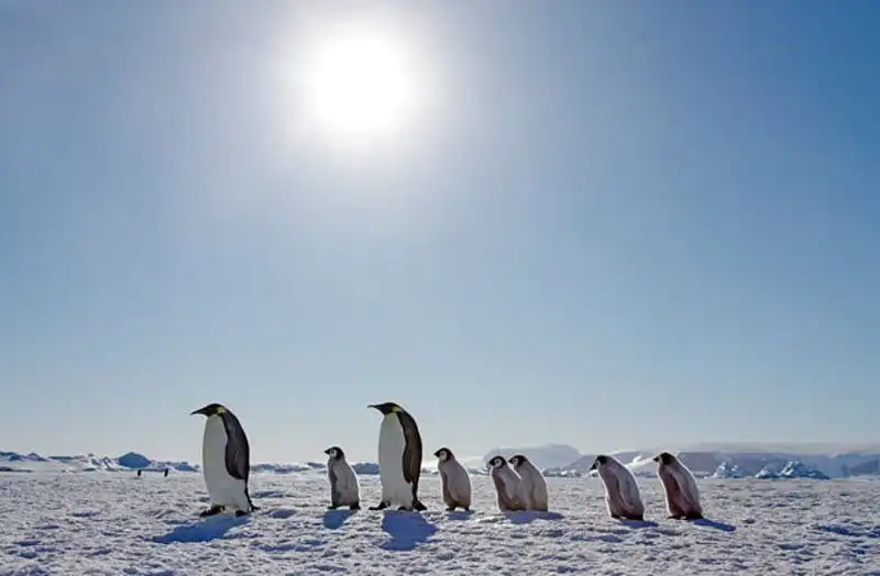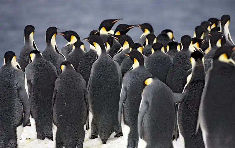 Императорские пингвины собрались на льду перед погружением в море. (PAL HERMANSEN / STEVEBLOOM.COM / BARCROFT MEDIA)