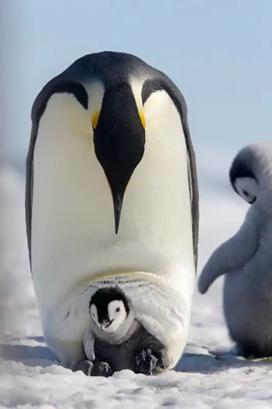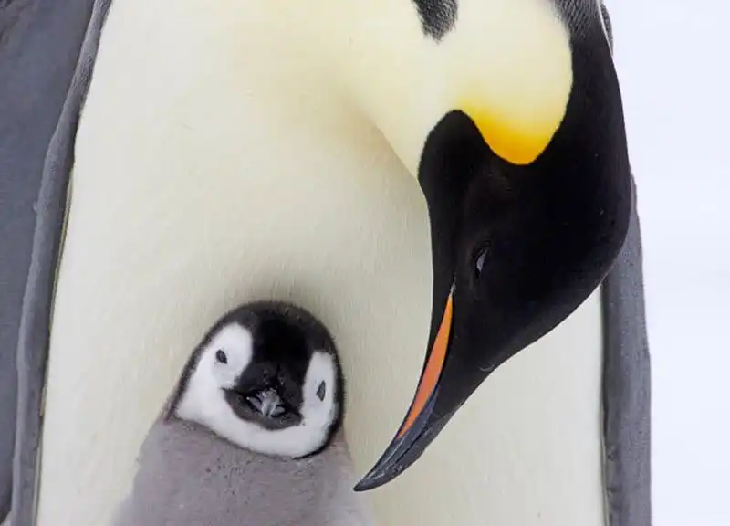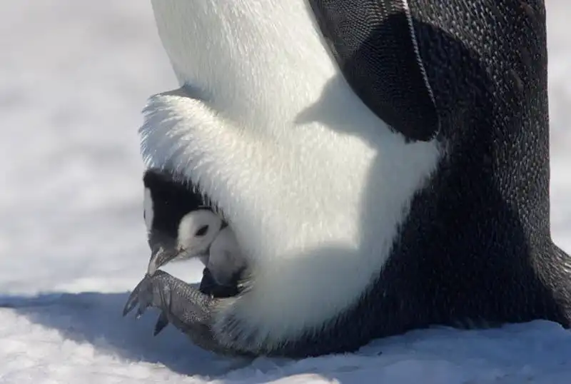 Детеныш императорского пингвина выглядывает из-под ног своего отца на острове Сноу Хилл в море Уэдделла, Антарктика. (PAL HERMANSEN / STEVEBLOOM.COM / BARCROFT MEDIA)