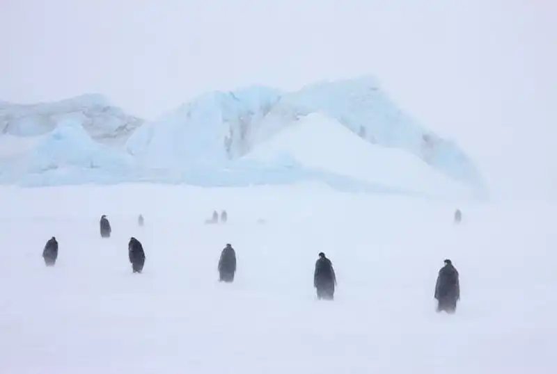 Императорские пингвины и их птенцы в снежной буре. (PAL HERMANSEN / STEVEBLOOM.COM / BARCROFT MEDIA)