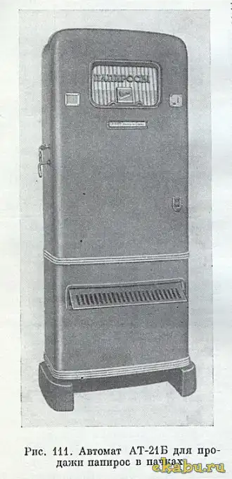 Автомат АТ-21Б для продажи папирос в пачках выдаёт одну пачку папирос за установленное количество монет 15-копеечного достоинства опущенных в его монетоприёмную щель.