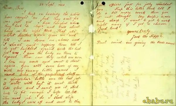 Первое пришло 27 сентября, оно начиналось со слов «Дорогой Босс» и заканчивалось подписью «Джек Потрошитель»