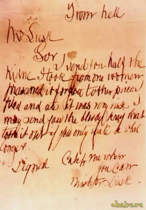 Третье письмо, озаглавленное «Из ада», пришло вместе с частью почки Эддоус (остальное маньяк якобы зажарил и съел) 16 октября.