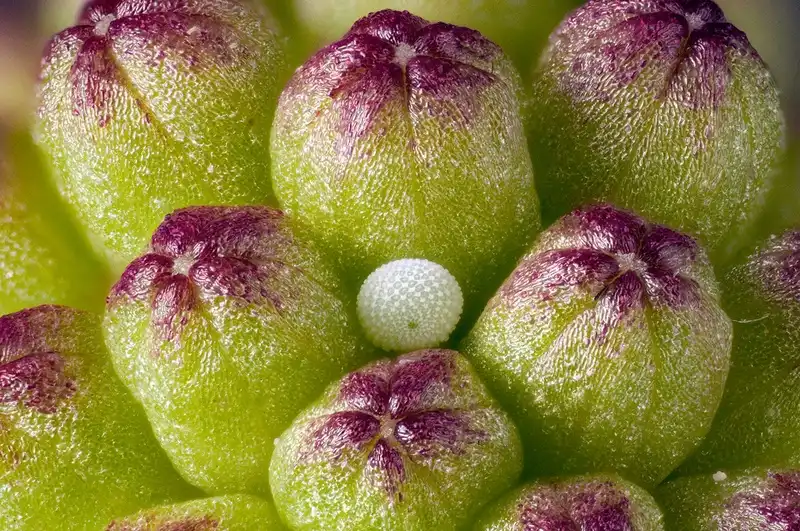 7. Яйцо малинницы в бутонах розовой розы. Изображение увеличено в шесть раз. Оно было сделано Дэвидом Миллардом из Остина, штат Техас.