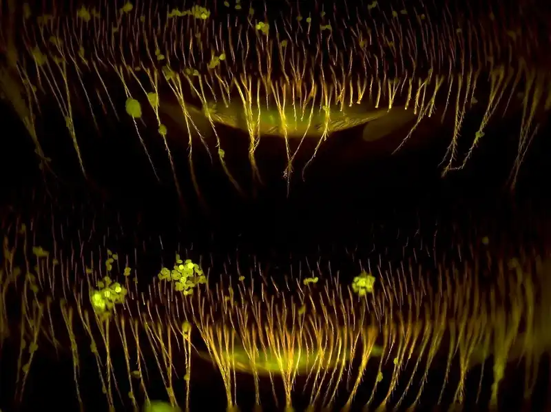 18. Увеличенный в 40 раз снимок живота пчелы с частичками пыльцы. Автор – доктор Роберт Маркус из Института генетики в биологическом центре Венгерской академии наук в Сегеде.