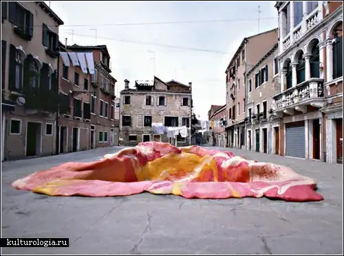 Кто бы мог подумать, что в таком чистом, красивом, ухоженном европейском городе, как Венеция, на улицах можно будет наткнуться на огромные куски жевательной резинки? И ладно бы они просто валялись, выброшенные неряхой-жевуном, а так все гораздо сложнее. Где-то кусок жвачки перегородил проезд, где-то прилип к асфальту и расплавился, став огромной лужей, а то и вовсе нахально торчит посреди улицы, как столб... Кстати, обвиняют в этом происшествии скульптора Симона Декера (Simone Decker).
