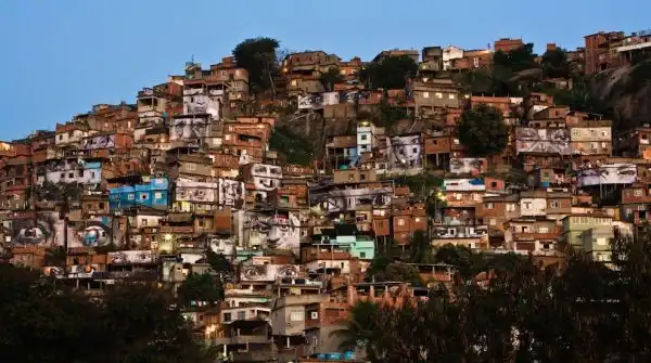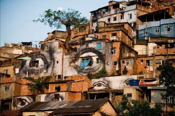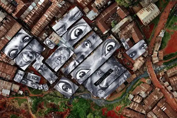 JR взял за основу для своего творения – 2000 квадратных метров крыш домов плотно расположенных между собой в Кибера. Женщины – героини в трущобах Кибера – Кения. Январь 2009 года.