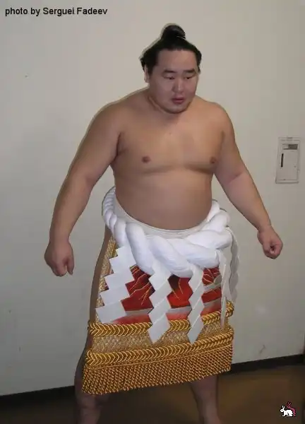 Затем следует ёкодзуна-дохё-ири , выход "великого чемпиона" . Ёкодзуна выходит в сопровождении глашатая и оруженосца , который несёт его ритуальный меч . Помимо кэсё-маваси он облачается в симэнава , специальный пояс из отбеленной рисовой соломы , напоминающий канат переменной толщины . Как видите , чтобы правильно его завязать , требуются усилия шести(!) сумотори . Потом он , видимо , просто срезается , так к новому басё ёкодзуна должен изготовить новый , на что ему выдаётся специальная сумма денег.