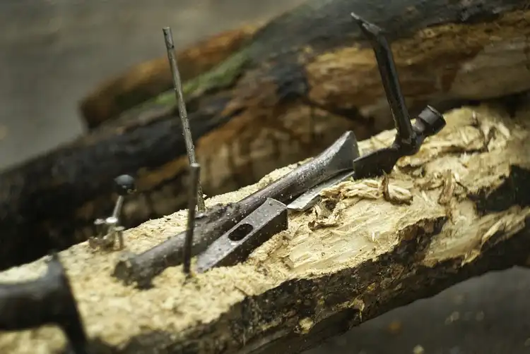 У костра лежит целая поленница аккуратных чурбанков, колят их нехитрыми самодельными инструментами.