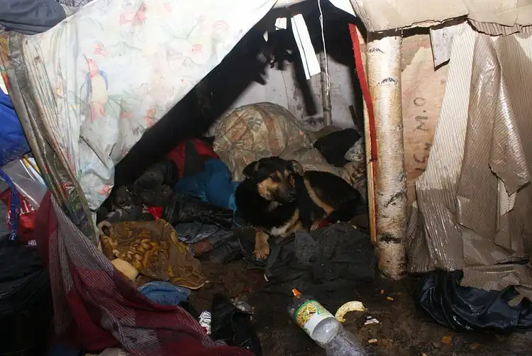 Снять внутреннее убранство дома помешали спящие. Как нам рассказал Борис в доме спит ночная смена-собиратели. Жители лагеря делятся на профессии - собиратели(работают преимущественно по ночам), попрошайки и сам Борис с собакой, они отвечают за чистоту, порядок и охрану жилища.