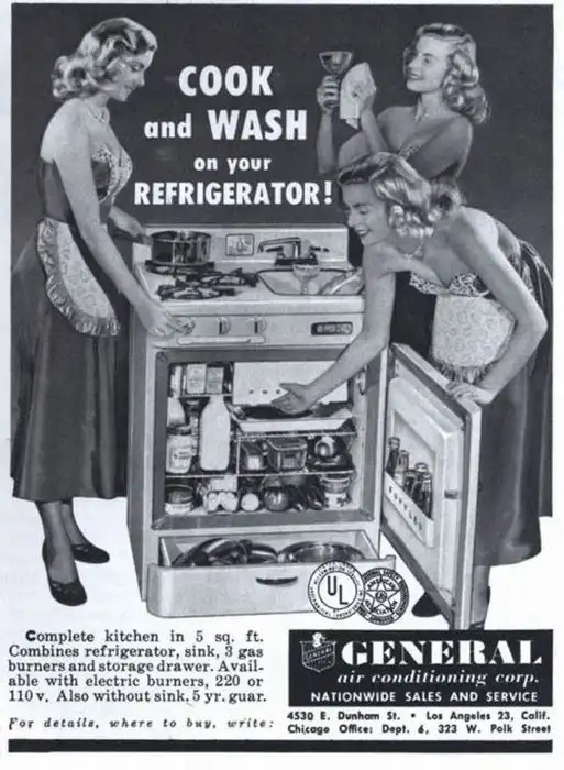 "Целая кухня в 5 квадратных футах (~0,5 кв. метра). Холодильник, раковина, 3 газовых конфорки и ящик для посуды.